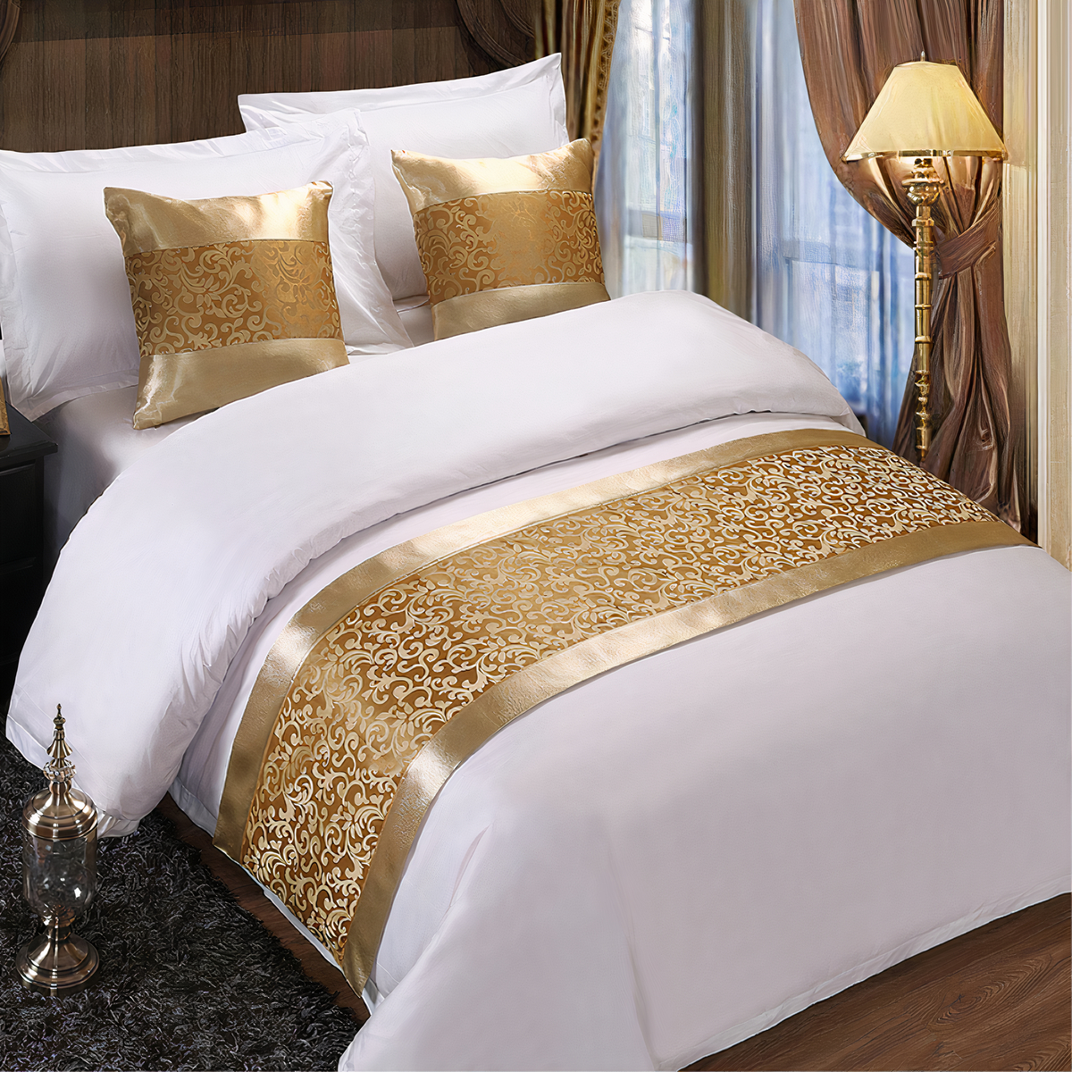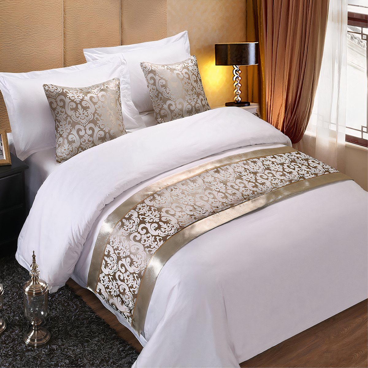 Plongez avec bonheur dans votre superbe lit recouvert de notre belle parure en satin. Rehaussé de somptueuses bordures dorées ou argentées selon vos goûts, les motifs opulents ajoutent une touche de raffinement à votre chambre, transformant votre espace de sommeil en un havre de confort et d’élégance.