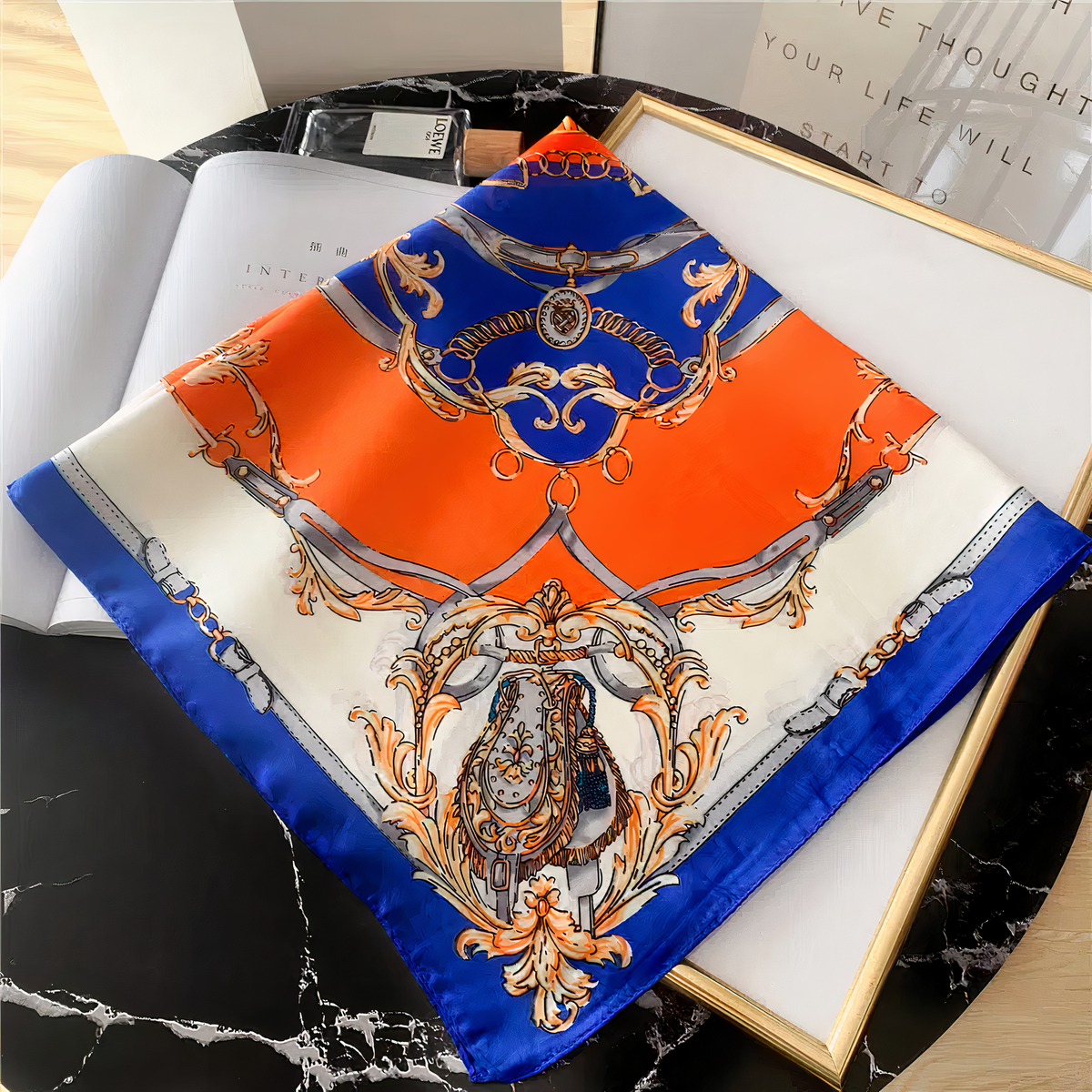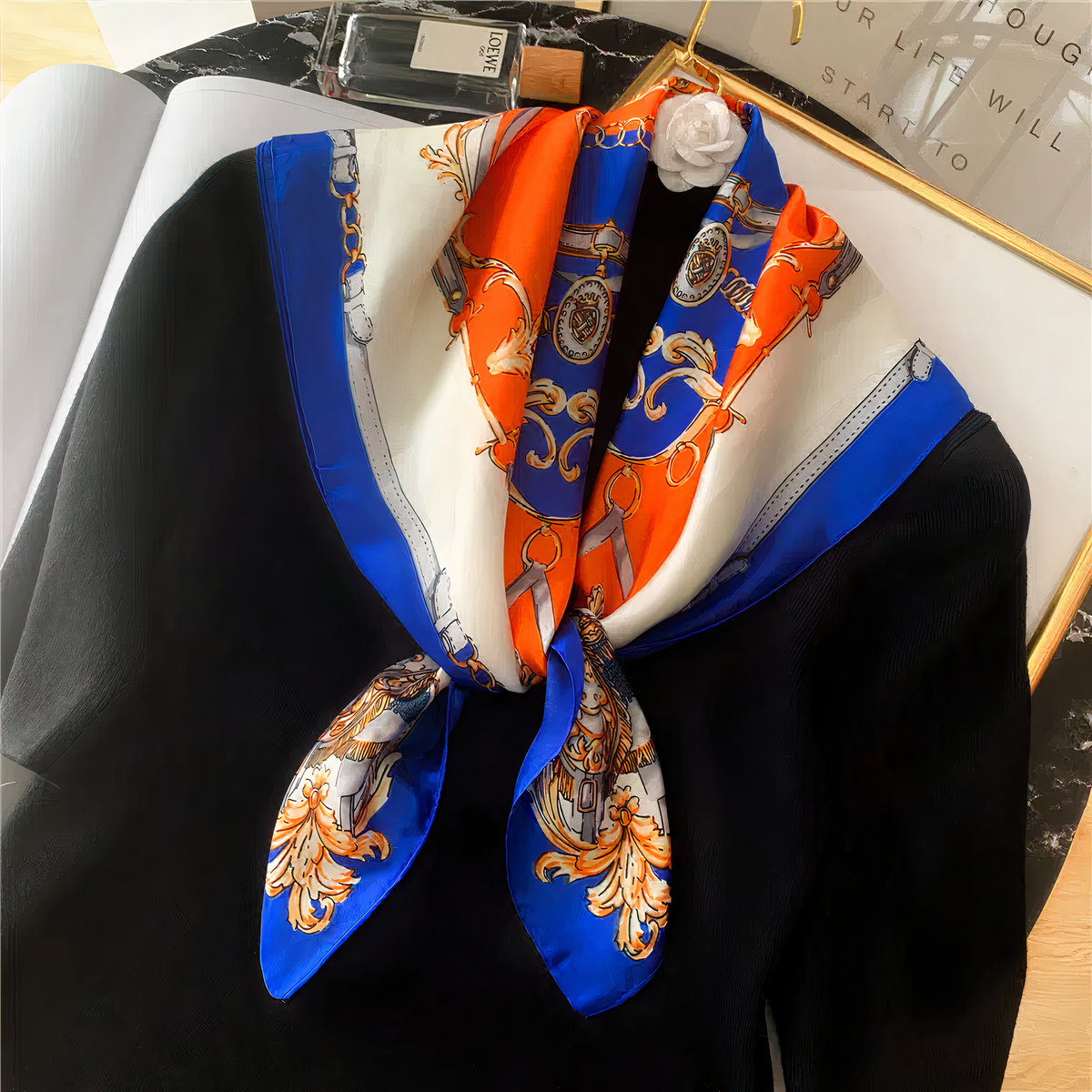 Exprimez-vous avec notre foulard carré en satin. Le blanc symbolise la pureté, idéal pour un look raffiné et intemporel. Le bleu évoque la sérénité, parfait pour une touche de calme et d’équilibre. L’orange représente la joie, apportant une note de dynamisme à votre tenue.