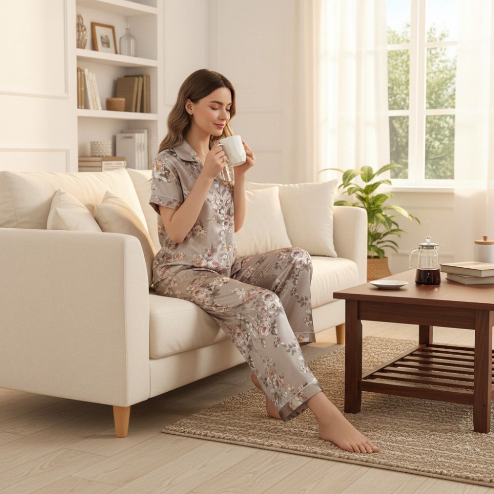 Cet ensemble est agréable à porter en toute saison. Sa coupe fluide et son col chemisier vous donnent une allure féminine et flatteuse. Que ce soit pour une soirée tranquille à la maison ou pour se glisser dans les bras de Morphée, ce pyjama en satin est un choix idéal.