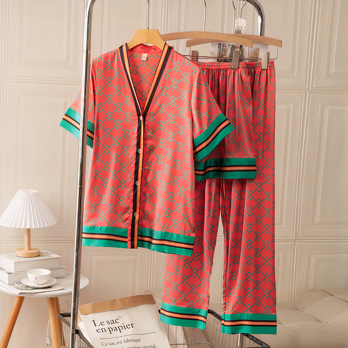 Les motifs nous rappellent ceux d’une célèbre marque de luxe, pour un ensemble de pyjama chic. Des couleurs chatoyantes pour se pavaner dans votre appartement, se détendre sur le canapé et pourquoi pas une petite sortie ? ce pyjama offre une sensation luxueuse contre la peau. Les motifs peuvent varier, allant des imprimés floraux délicats aux motifs géométriques modernes, ajoutant une touche de style et de personnalité à l’ensemble.