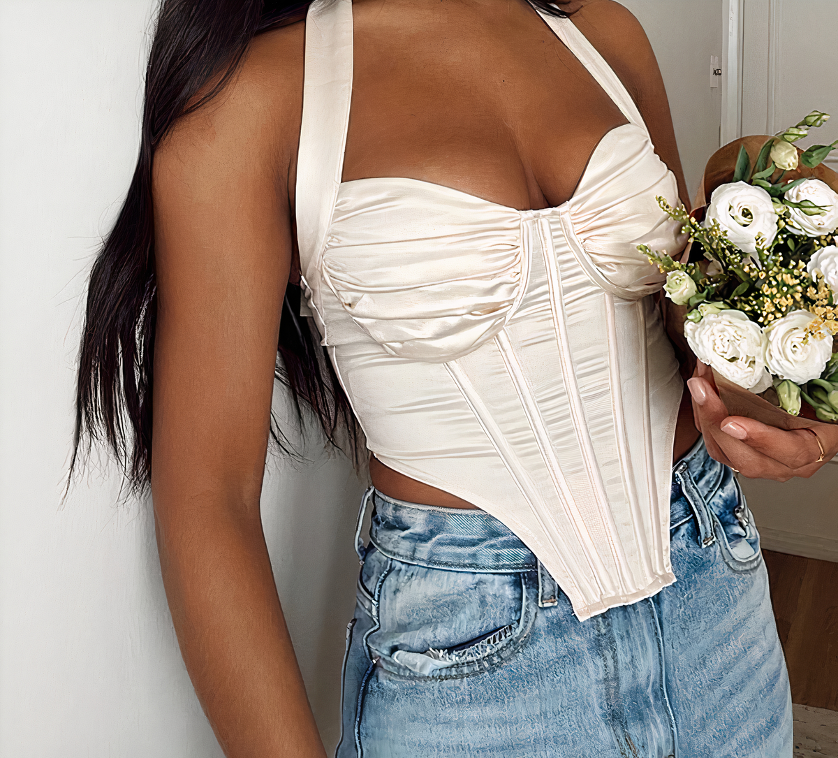 Que ce soit pour une soirée spéciale, une sortie entre amis ou simplement pour vous sentir confiante et séduisante au quotidien, ce crop-top beige en satin façon corset est un choix parfait pour faire tourner les têtes et vous sentir irrésistible.
