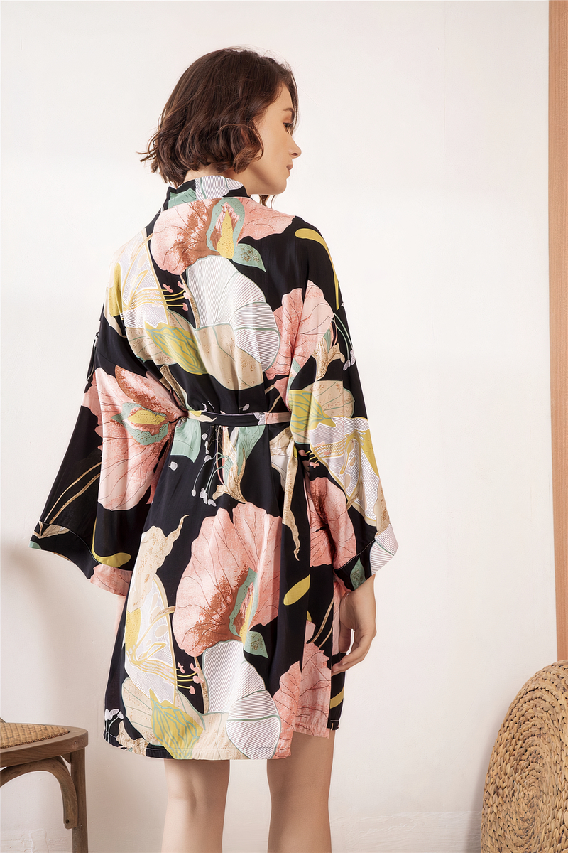 Vous restez à la maison mais vous avez envie de vous sentir belle et élégante, c’est chose faites avec ce peignoir. Un joli motif qui égayera vos moments de détente.