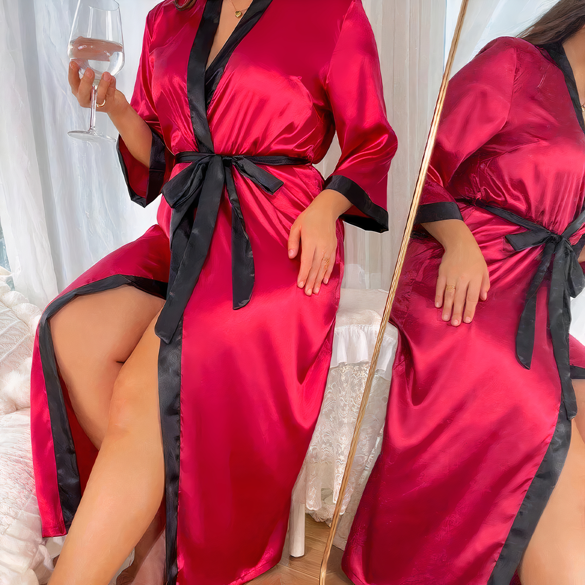 Pour vous détendre après une journée de travail ou simplement vous sentir belle et élégante à la maison, cette robe de chambre rouge et noire en satin pour femme est un choix idéal. Enfilez cette robe de chambre en satin pour des soirées romantiques et captivez le regard de votre partenaire.