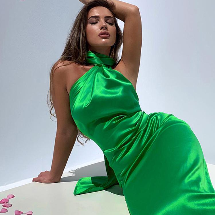 Faites sensation avec notre robe longue en satin dos nu verte. Sa matière douce et lumineuse enveloppe votre silhouette avec élégance, ajoutant une touche de glamour à votre look.