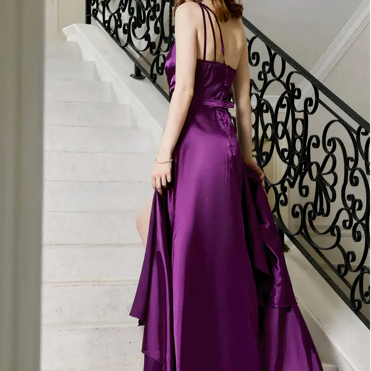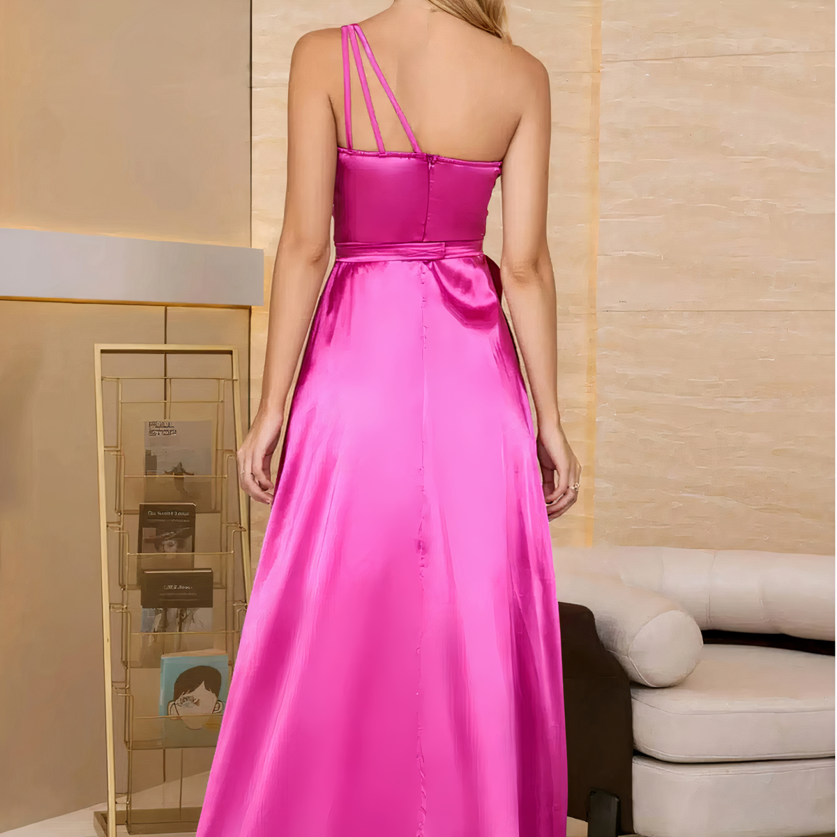 La fente sur le côté de la robe apporte une touche de sensualité et laisse apparaître vos jambes avec subtilité. Elle dévoile votre féminité, créant ainsi un contraste subjuguant avec le long drapé de satin qui enveloppe le reste de votre corps.